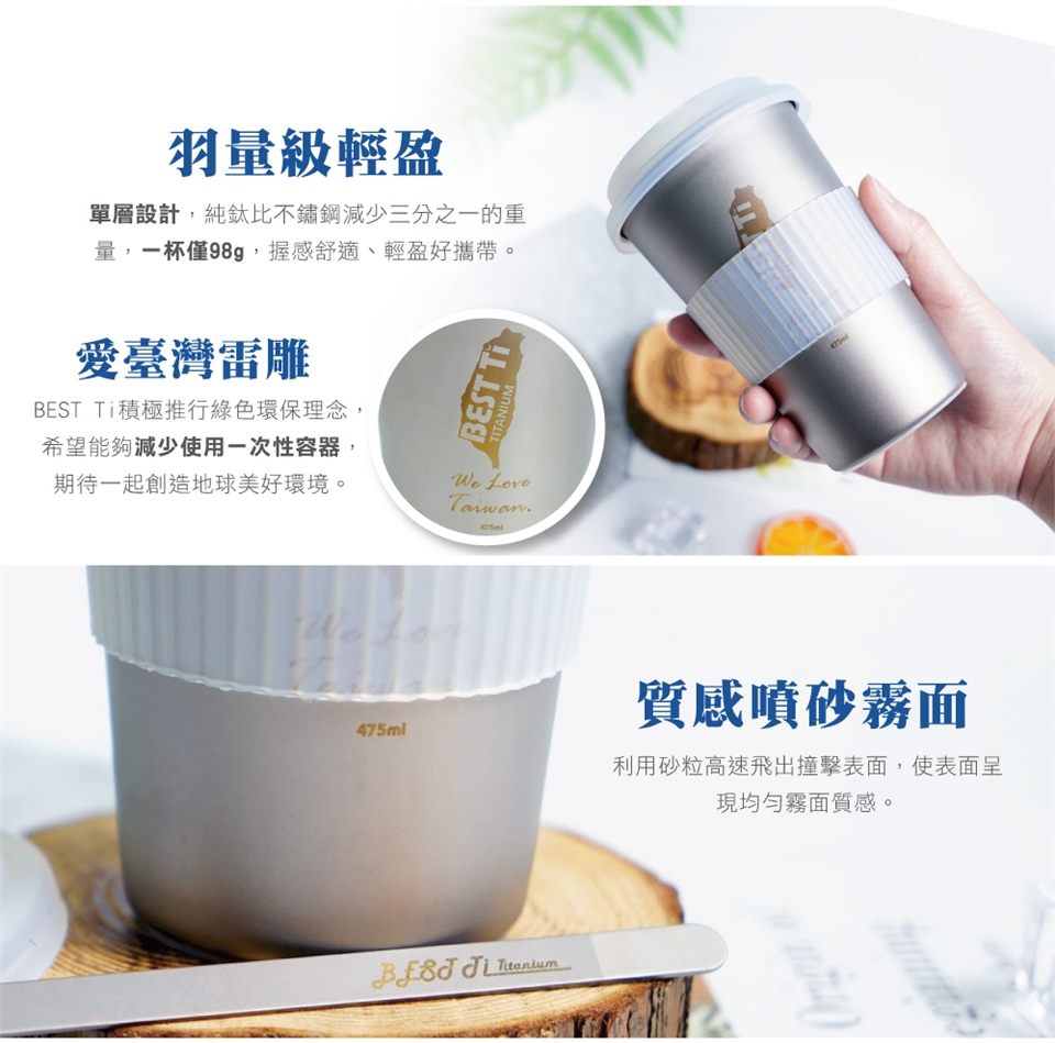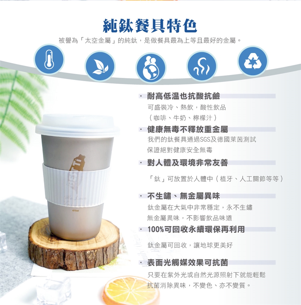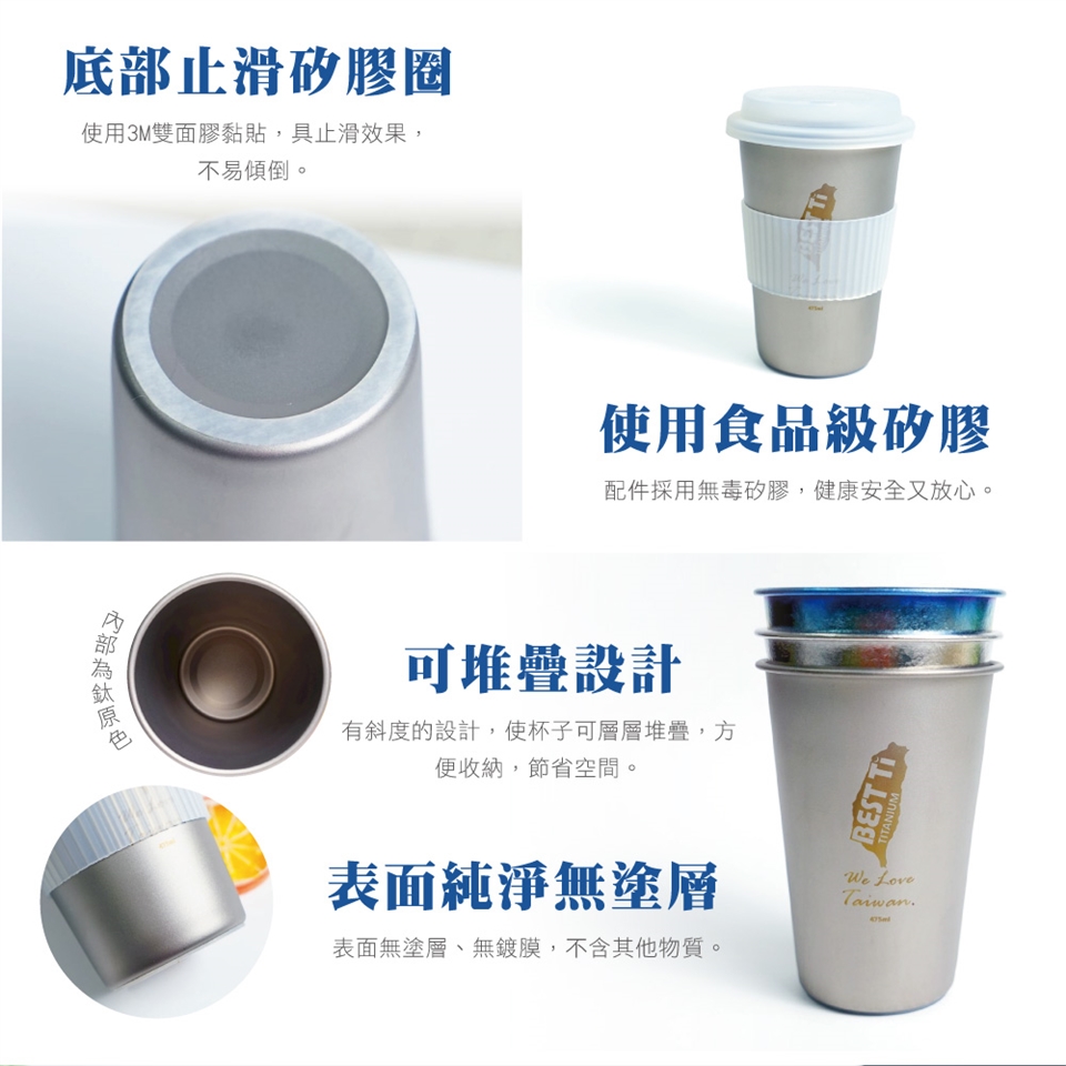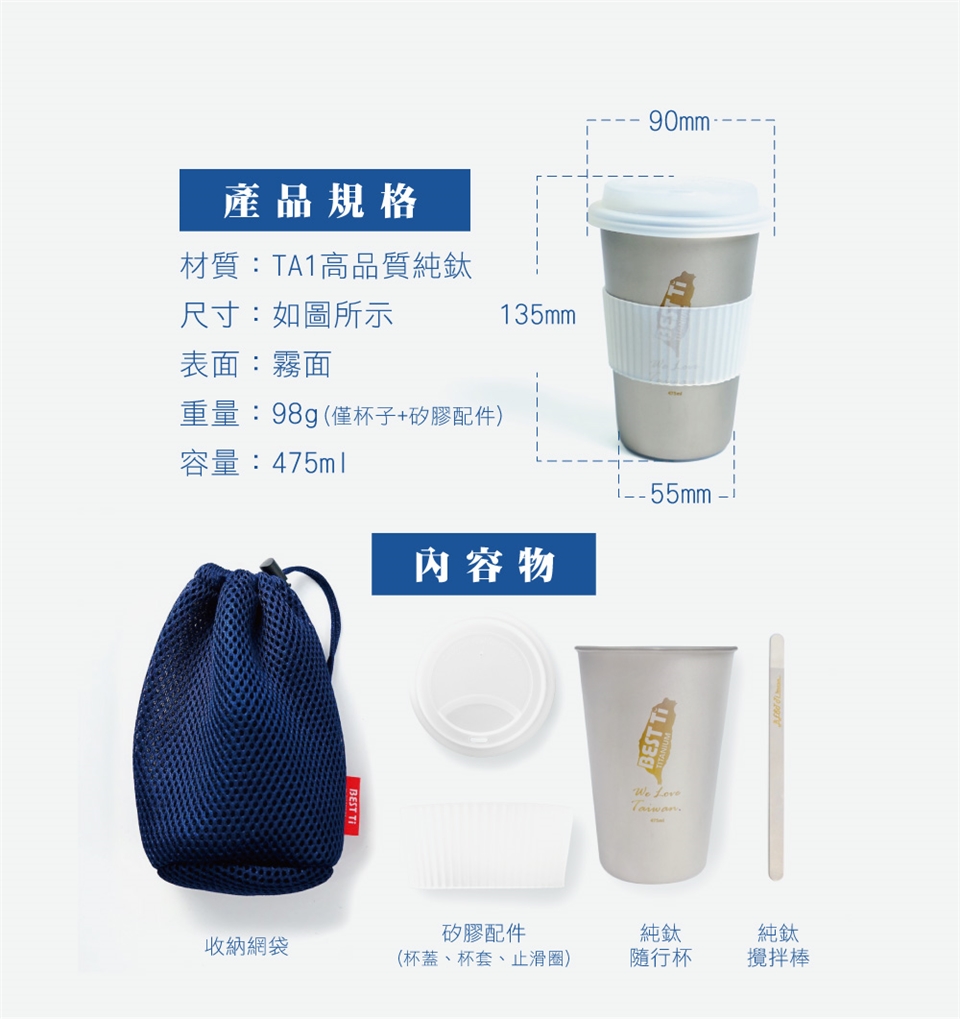 內容物:隨行杯*1、矽膠配件*1、收納袋*1、純鈦攪拌棒*1