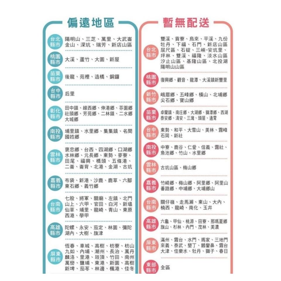 (花蓮全區,屏東全區,南投全區,台東全區和【暫無配送區】皆無運送服務)。