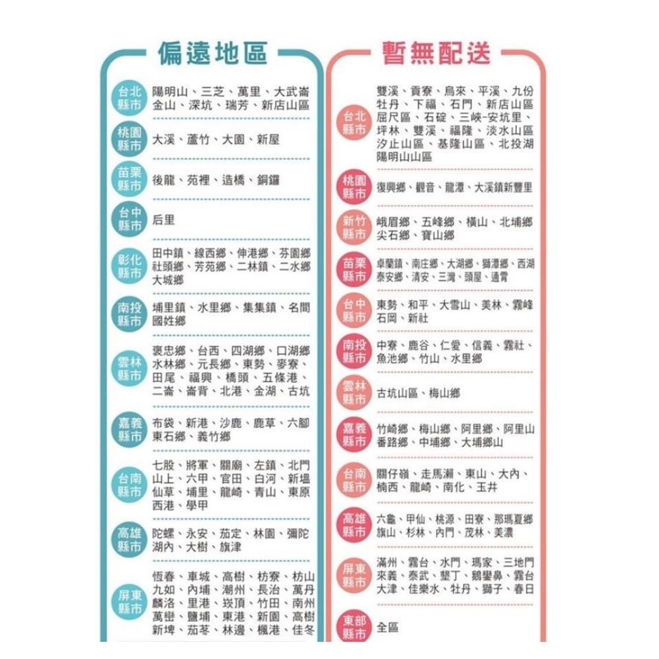 (花蓮,台東,南投,屏東,及偏遠地區和暫無配送地區皆無運送服務。)