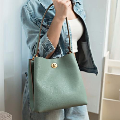 MYMY 率性亮眼 雙層鎖扣水桶包 馬卡龍綠 (牛皮提把/手提/肩背/側背/協背/可調式背帶)
