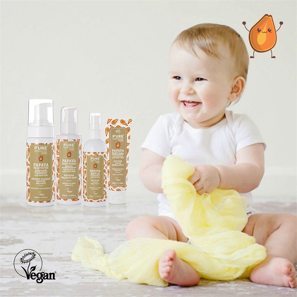 澳洲Pure papayacare是澳洲G&M公司所最新產出的由番木瓜為主材料的嬰兒用商品系列,推出後大獲澳洲市場所歡迎,還有得到澳洲許多大獎及認證。包括”最佳嬰兒用泡泡洗滌”銀獎,Bambini Baby Awards 2021,”素食可用”認證等等。
