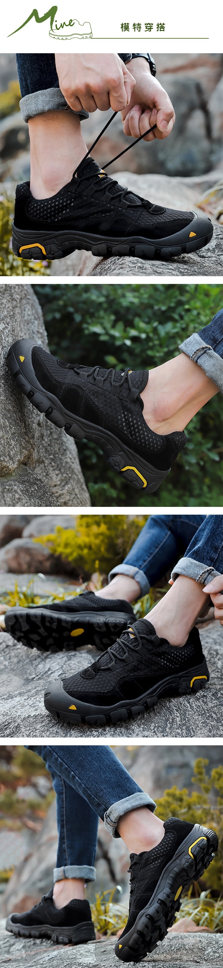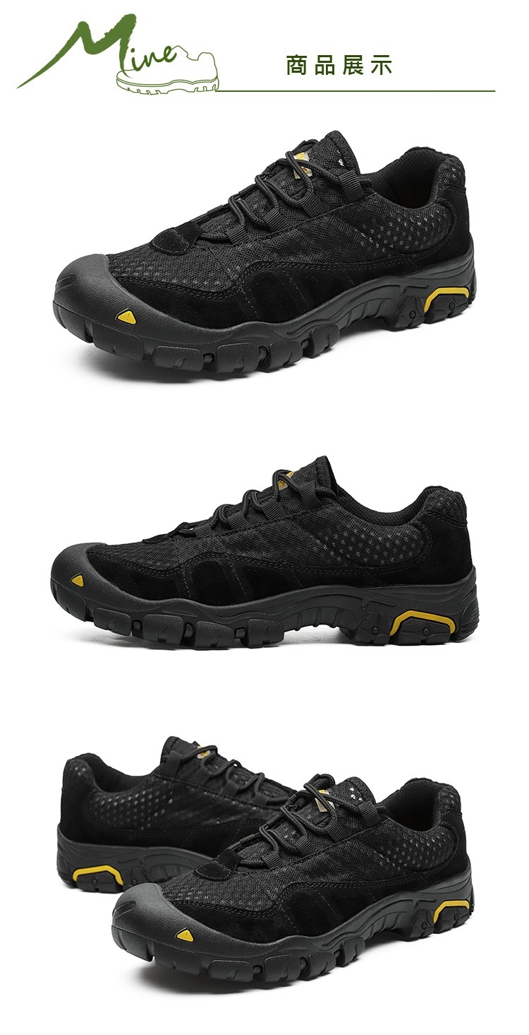 【MINE】登山鞋 休閒登山鞋/真皮異材質網布拼接護趾機能繫帶戶外休閒登山鞋-男鞋 黑