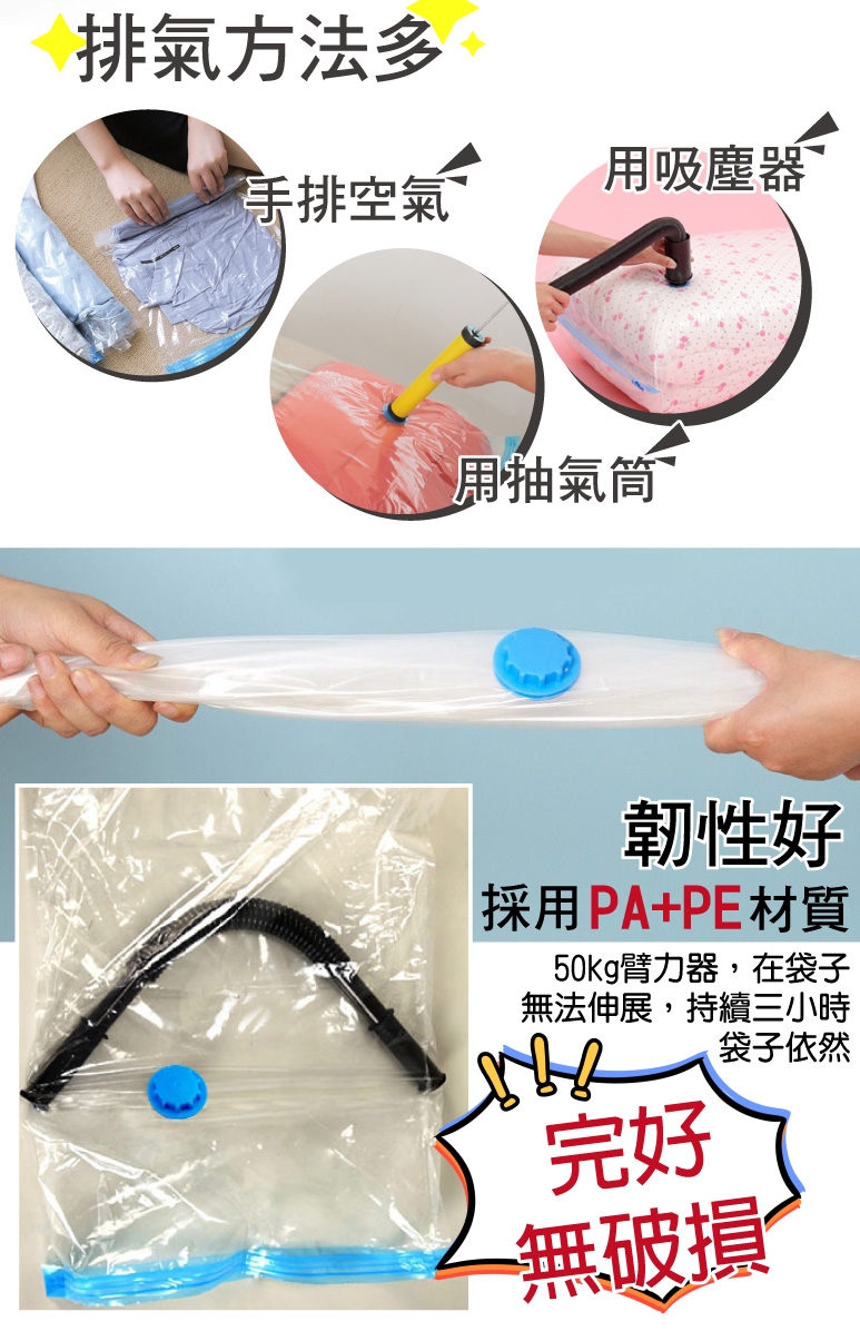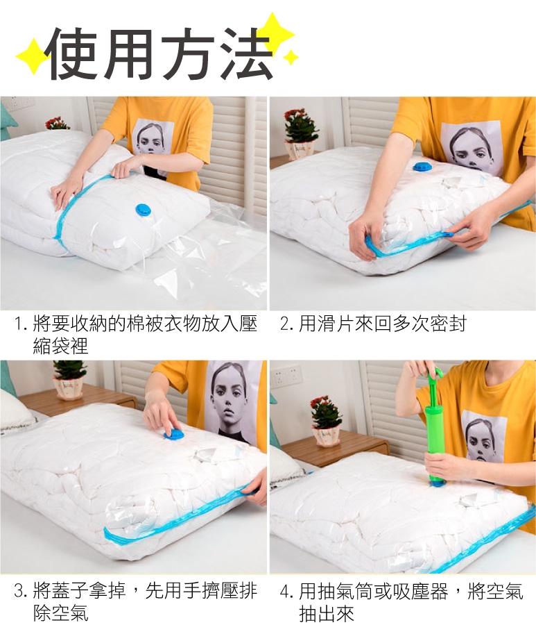 4.如有鈕扣、拉鍊等凸起物,請將凸起物向內折,請勿接觸壓縮袋表面,容易造成破洞