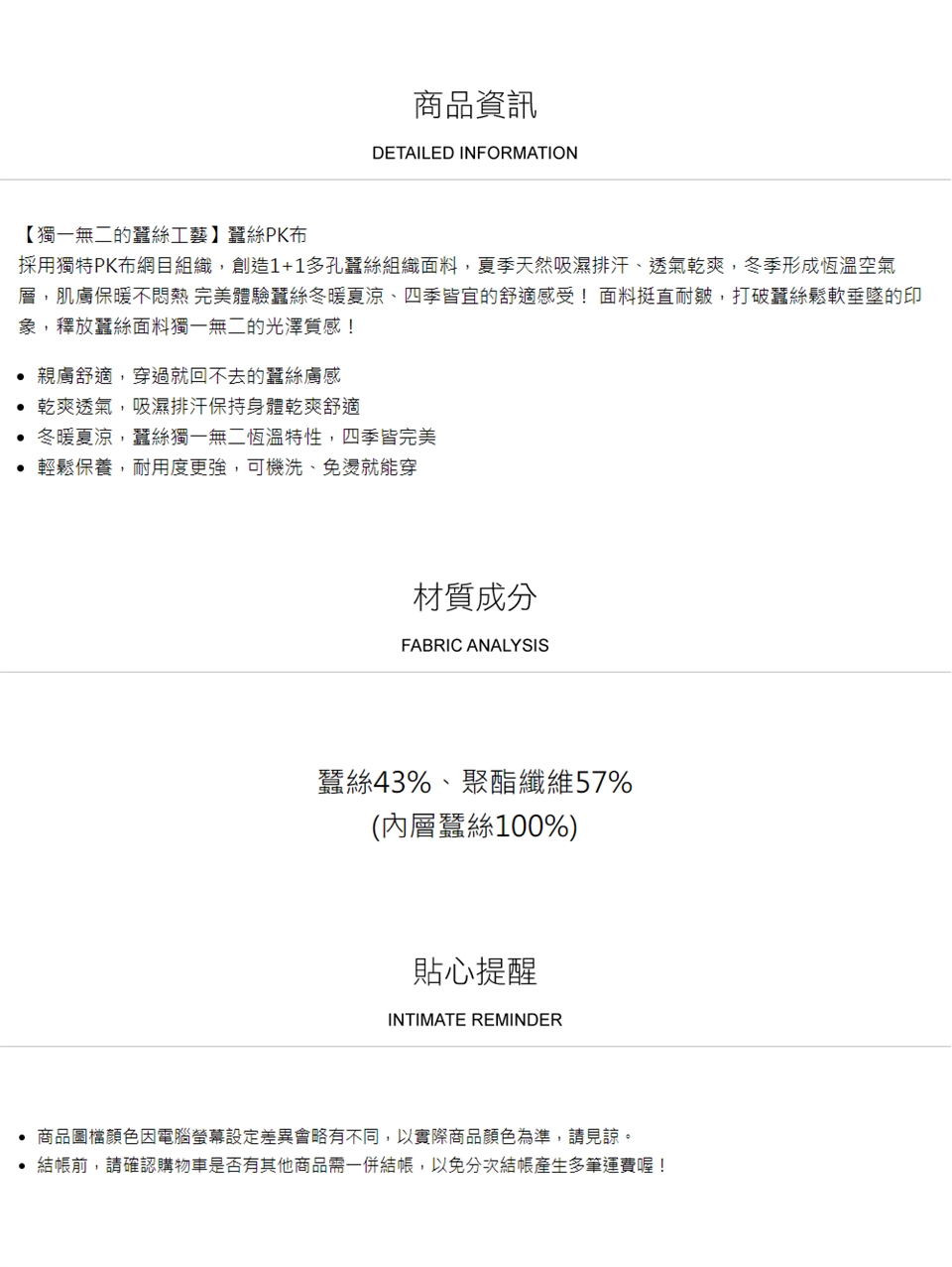 ► 請避免於太陽直射處曝曬,避免蠶絲纖維損壞。