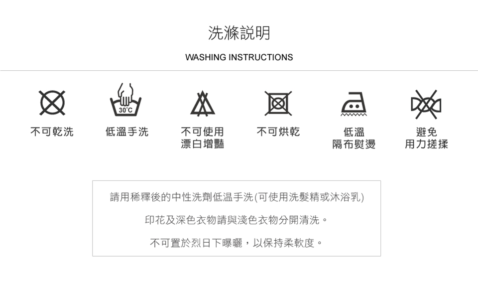 ► 建議可使用洗髮精、沐浴乳(可直接清洗皮膚之清潔產品)或蠶絲專用中性洗劑,使用低溫冷水稀釋過後,不浸泡,輕柔手洗方式進行清潔。