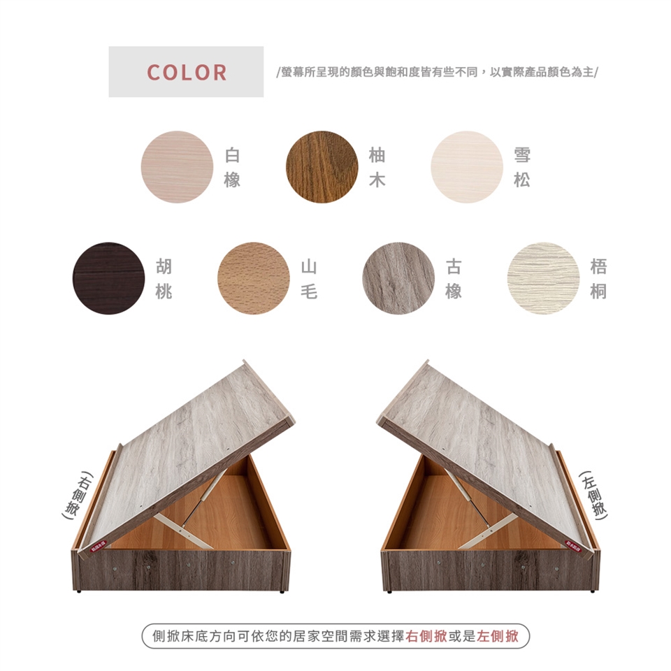 掀床開口方向,可依據您的居家空間擺設需求,選擇右側掀或是左側掀!