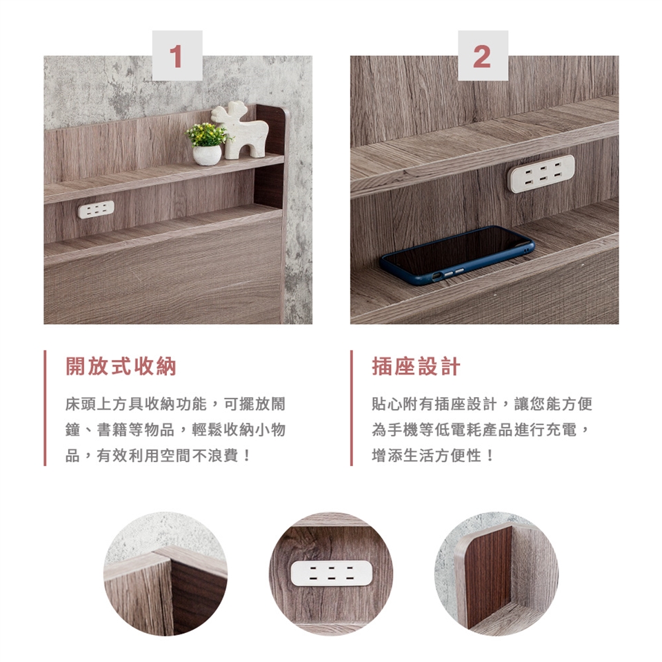 床頭為開放式置物收納,輕鬆收納各式床邊小物,給您更便利的日常生活!