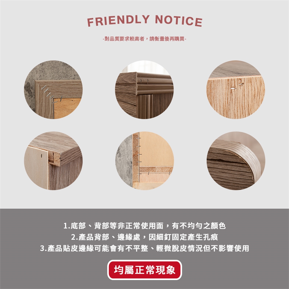 (3)此為基本款量產商品,部分細節無法盡善盡美,非正常使用面皆無貼皮處理,背面或邊緣處會有釘痕、貼皮輕微不平整及脫皮等情況,均屬正常現象且不影響使用,如果您對品質有較高要求者請審慎購買。