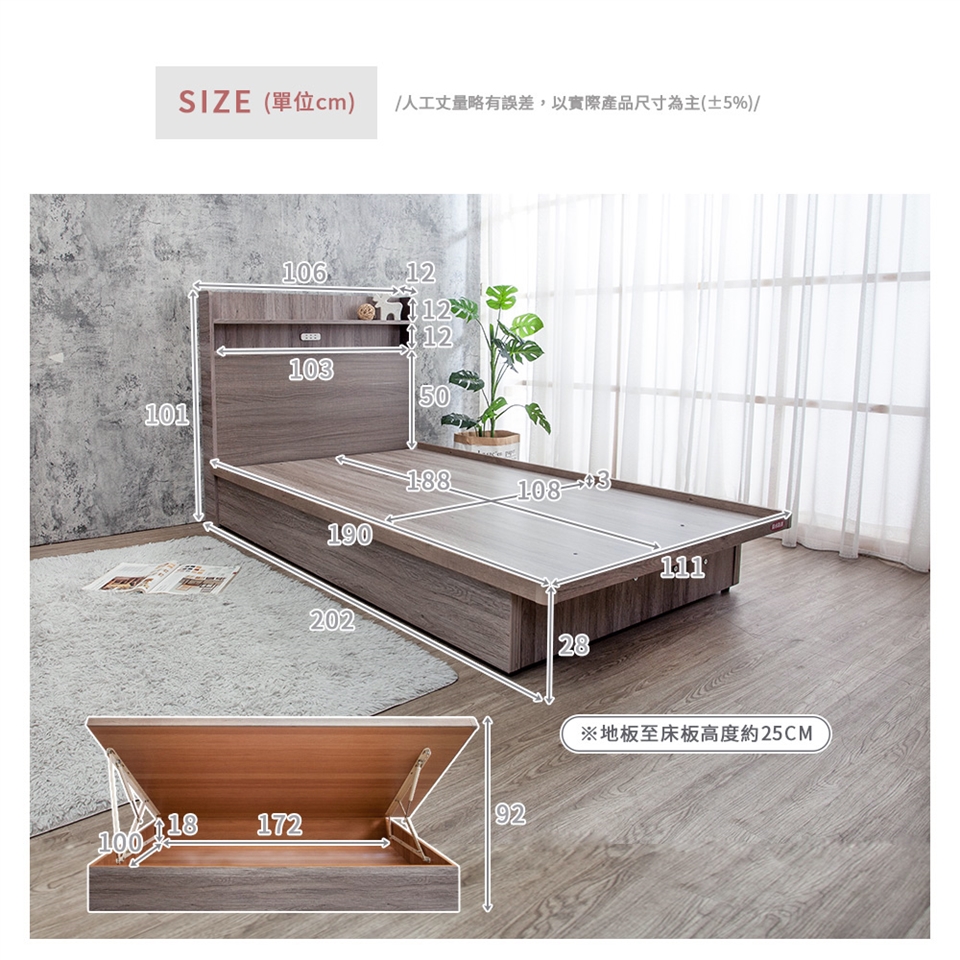 床頭片厚度僅12公分不佔空間,套房、小房間首選收納型,有效利用空間不浪費!