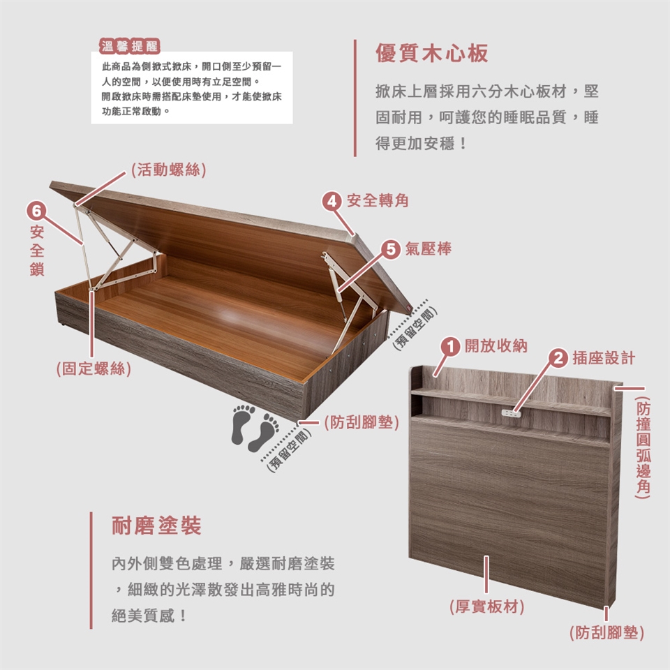 床板選用厚實的六分木心板材,呵護您的睡眠品質,睡得更加安穩!