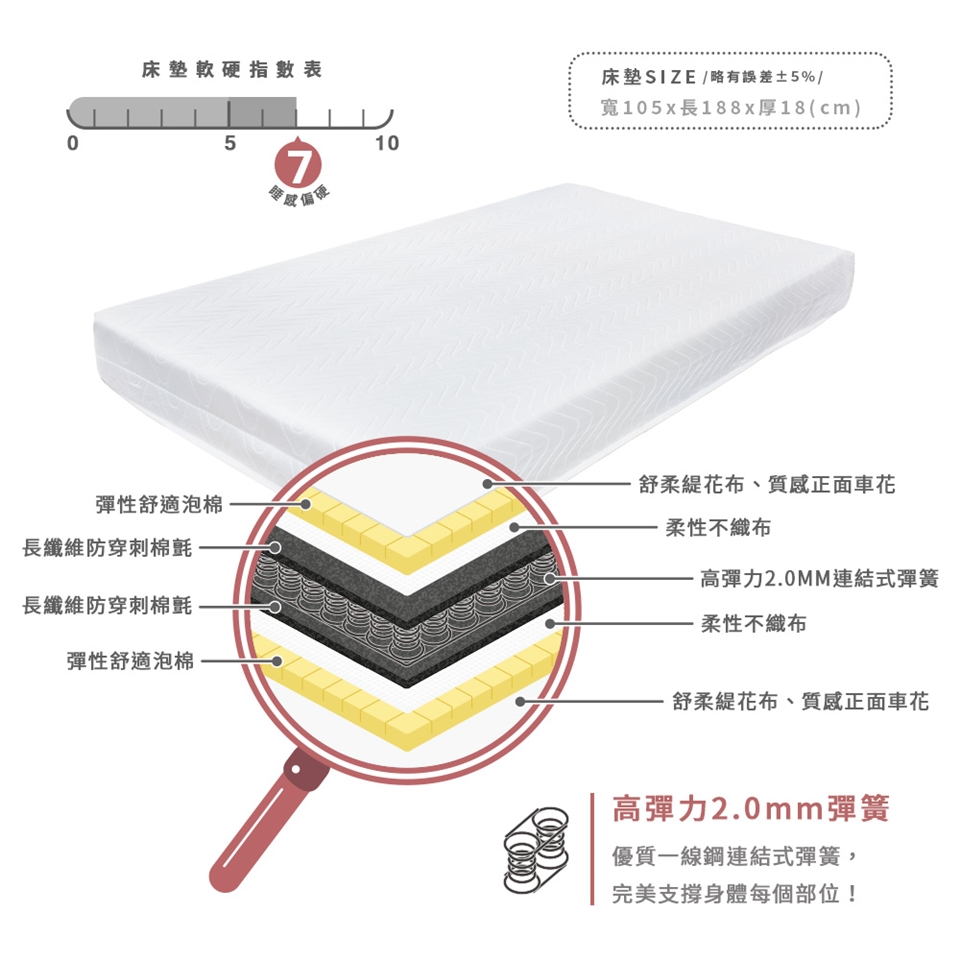 床墊彈簧採用優質高彈力2.0mm線徑一線鋼連結式彈簧,完美支撐身體每個部位!
