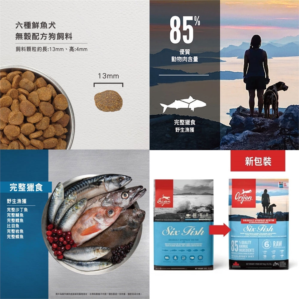 加拿大 Orijen Six Fish 六種鮮魚犬無榖狗飼料,富含85%野生漁獲肉含量,