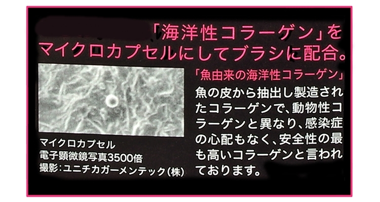 ●含有海洋性膠原蛋白,利用微膠囊技術鎖在髮梳內,在梳頭髮時達到柔順效果。