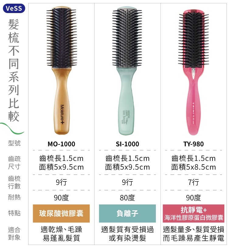 ●【品名】日本製VeSS專業3程序抗靜電髮梳TRINITY抗菌魔髮梳TY-980(適受損染燙髮量多;導電彈性體+不鏽鋼除電纖維+接地片;含海洋性膠原蛋白微膠囊)美髮梳子