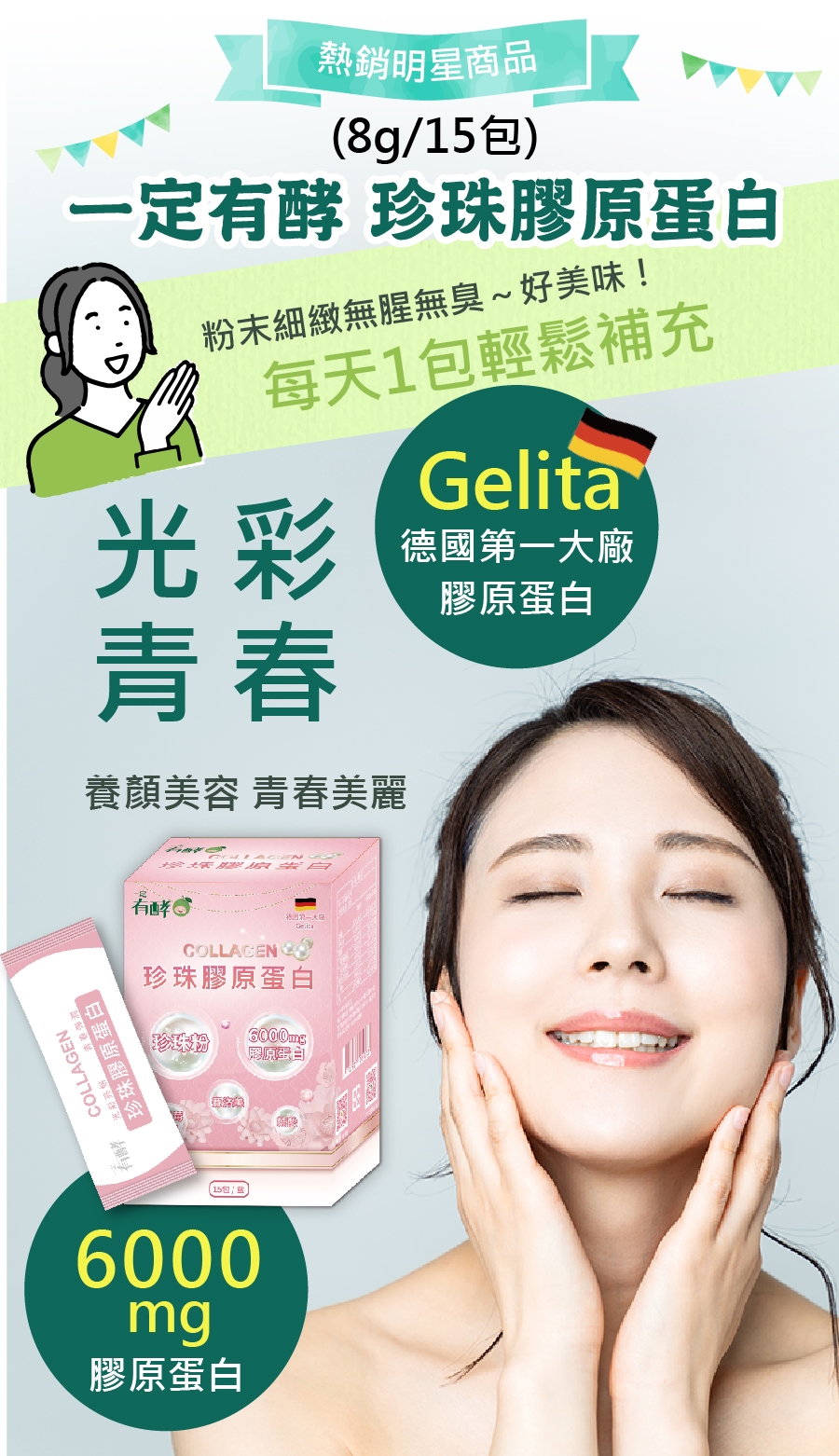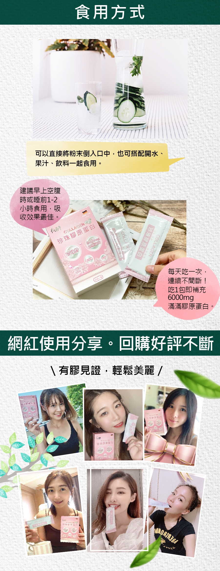每日1包,建議空腹或睡前1-2小時食用效果最佳,可搭配開水或飲品食用。