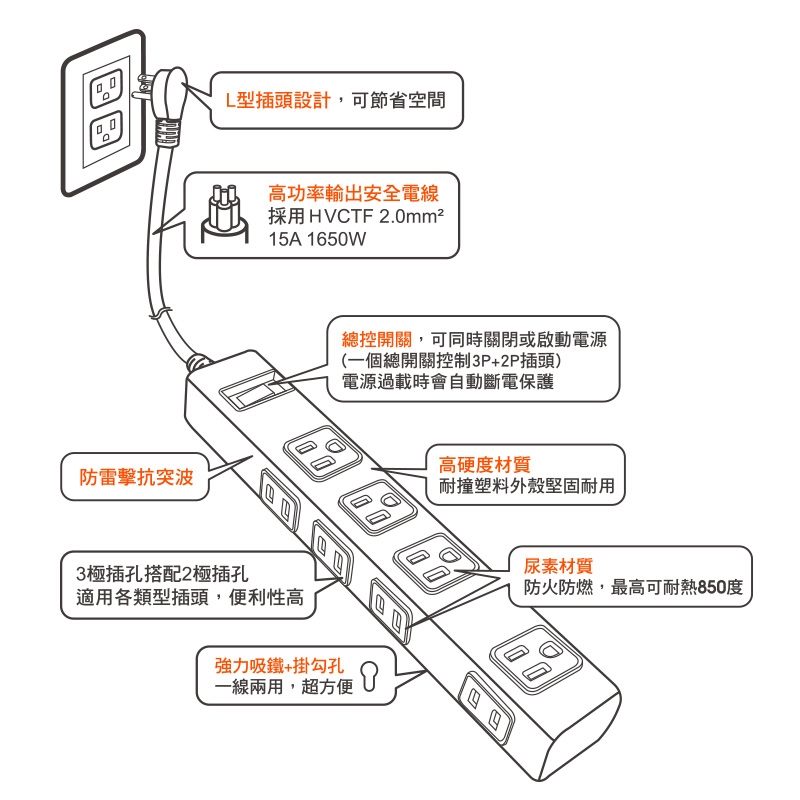 ● 品名:防雷擊3孔+2孔 8插延長線(磁鐵固定)