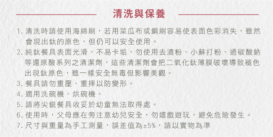 2.純鈦餐具表面光滑,不易卡垢,勿使用去漬粉、小蘇打粉、過碳酸鈉等還原酸系列之清潔劑,這些清潔劑會把二氧化鈦薄膜破壞導致褪色,出現鈦原色,雖一樣安全無毒但影響美觀。