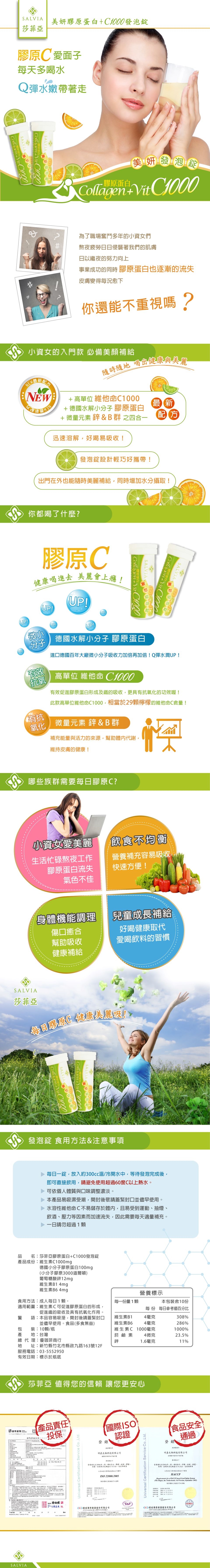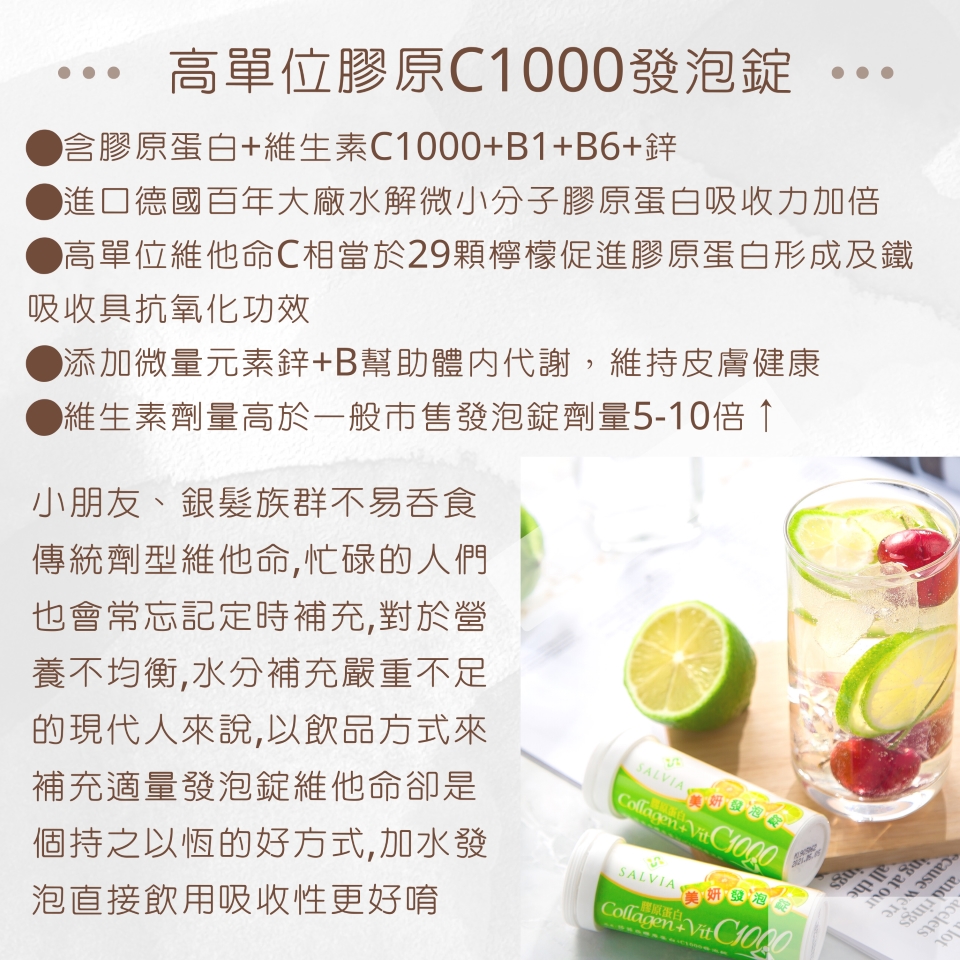 Salvia 美妍膠原 C 發泡錠 結合了德國頂級水解膠原蛋白與超高單位維生素 C,每一杯都相當於 29 顆檸檬的抗氧力量,精準促進膠原蛋白形成,鎖住您的青春光采。