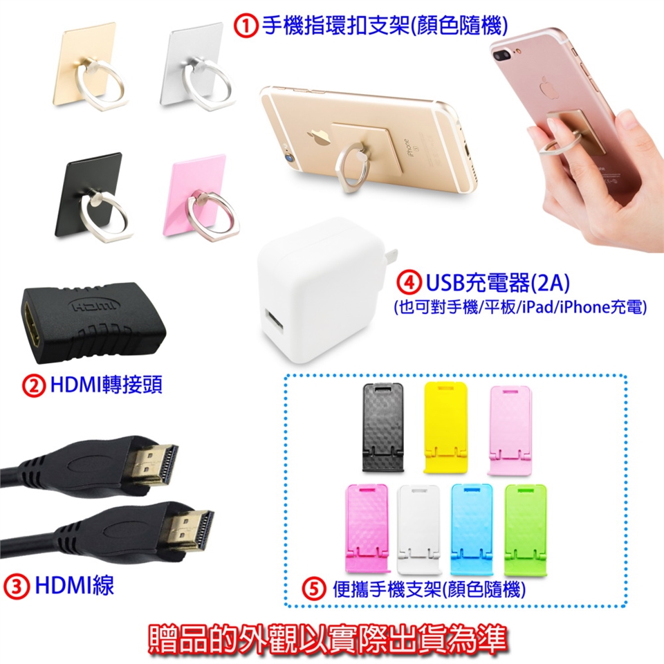 5大好禮: HDMI傳輸線x1 + HDMI轉接頭x1 + USB充電器(2A)x1 +電源開關插座x1 + 手機指環扣支架x1