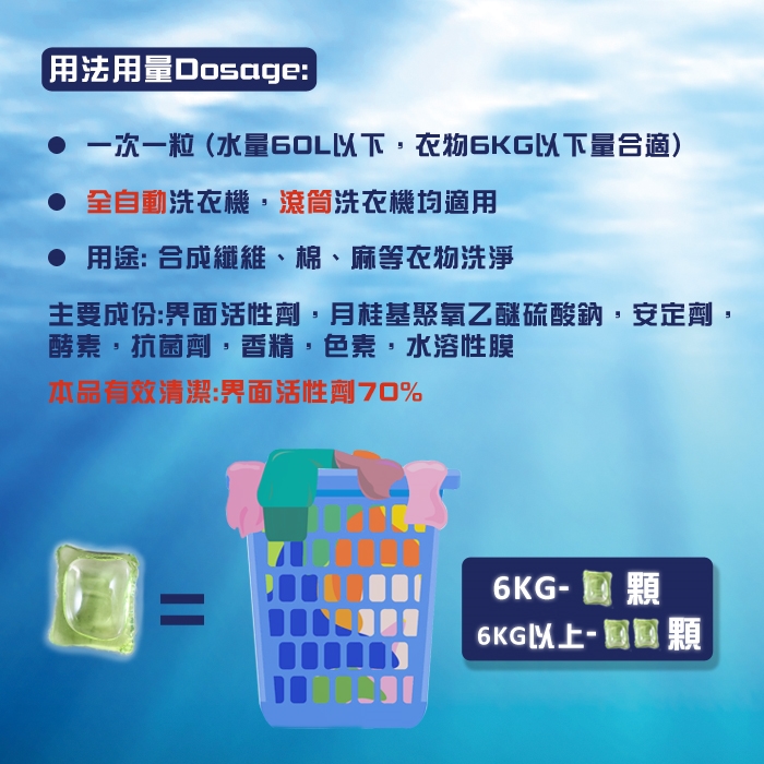 (1)一次一粒(水量60L以下,衣物6kg以下量合適 )