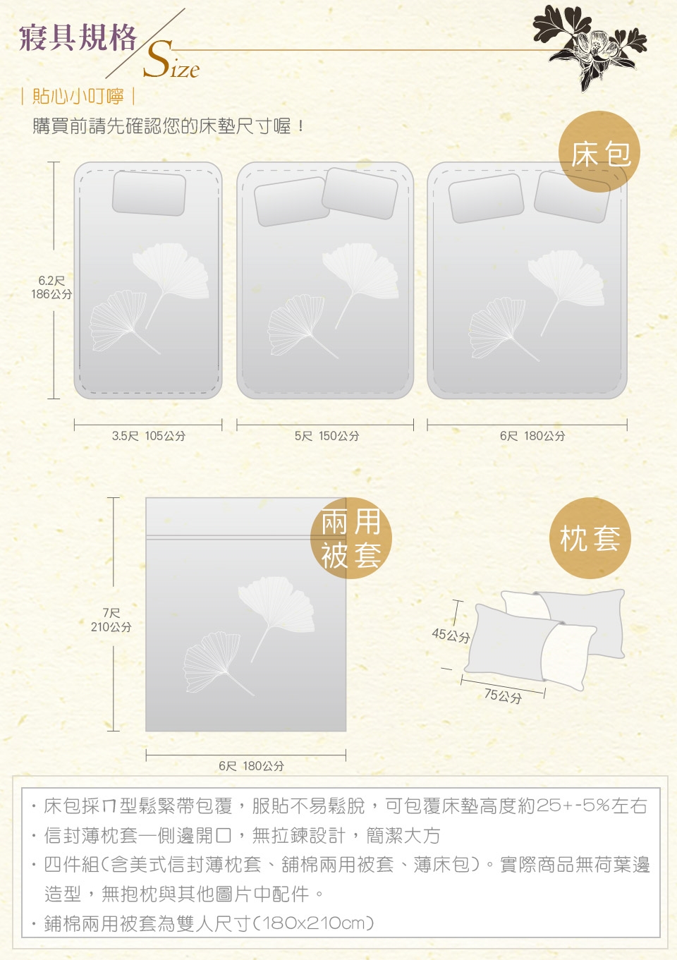 - 選購時請先確認好尺寸,以便能選購到與您床墊相符合的床組。