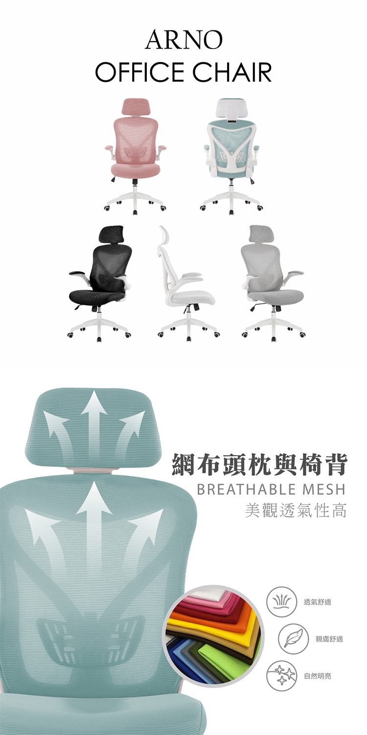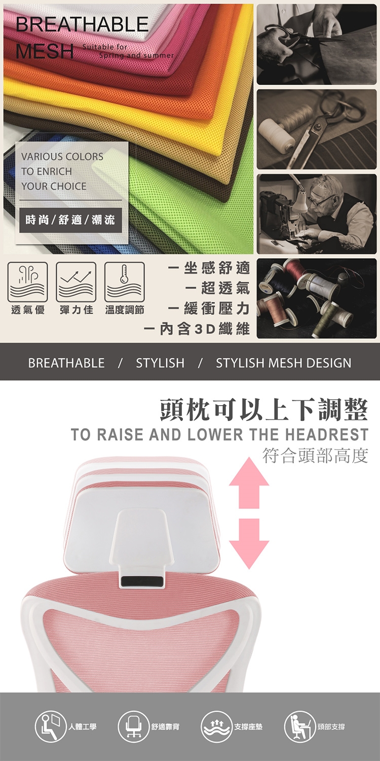 台灣與歐美同步販售、美規設計,網布頭枕與椅背,美觀透氣性高,頭枕可以上下調整符合頭部高度,