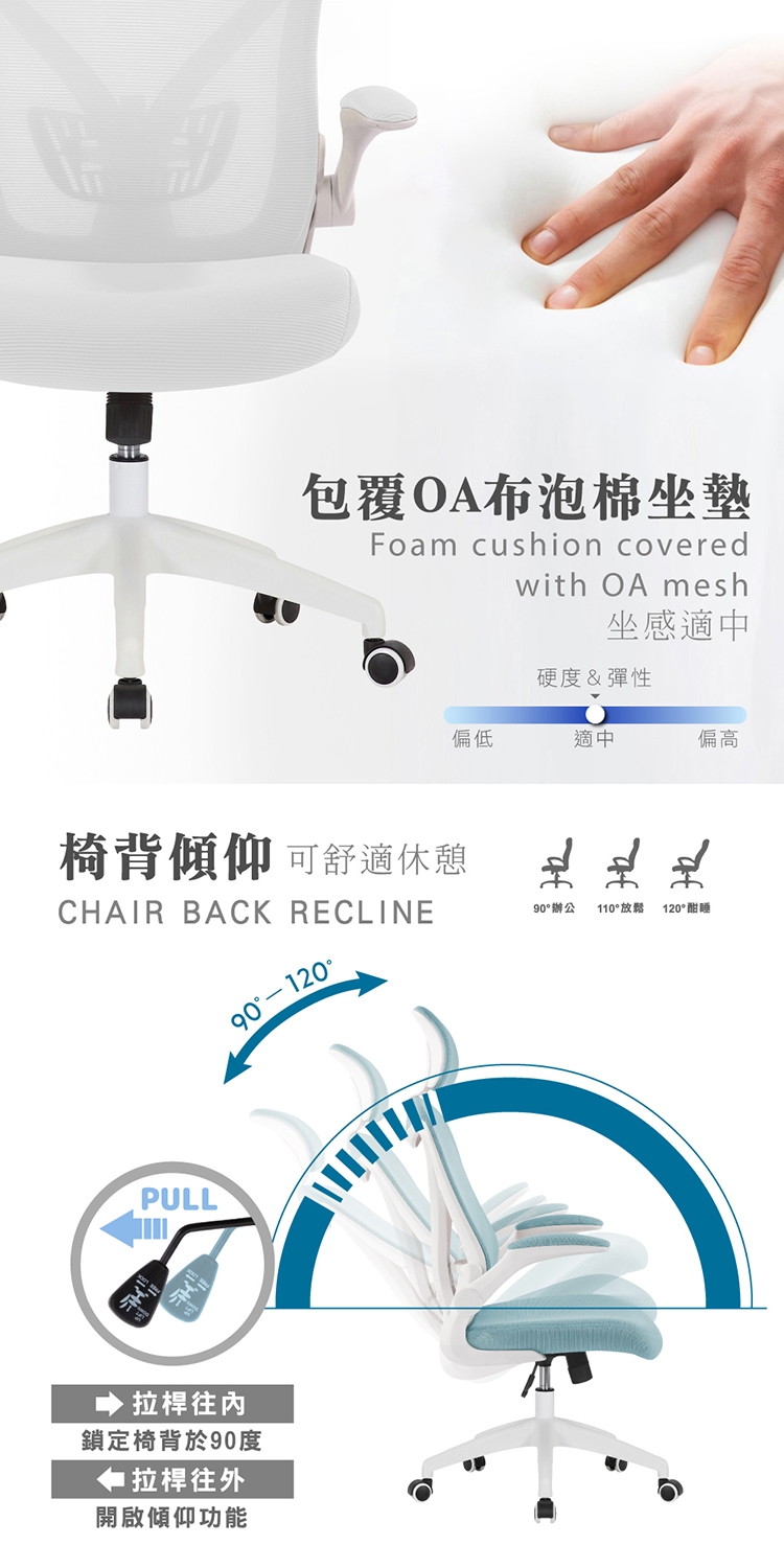 椅背採塑膠射出、腰部良好支撐,旋轉扶手,可完全收納靠於桌下,包覆OA布之泡棉坐墊、坐感適中,