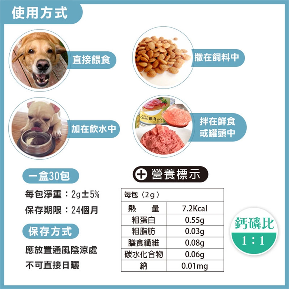 直接餵食、也可撒在飼料中或飲水中、亦可拌在鮮 食或罐頭中適量餵食。