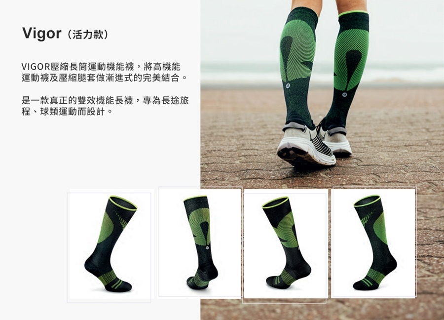‧ Vigor 長筒運動機能壓縮襪,將高機能運動襪及壓縮腿套做漸進式的完美結合。