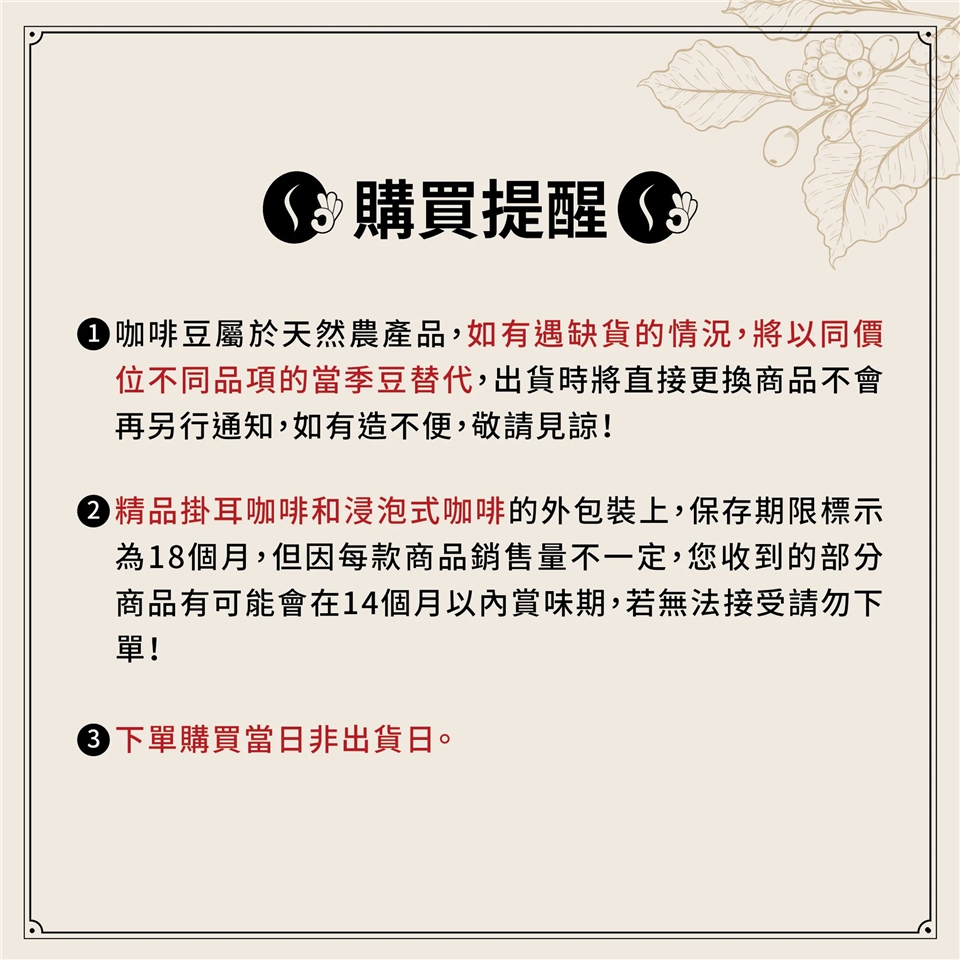 (3)精品掛耳保存期限標示為18個月,此為特惠商品組合,您收到的精品掛耳部分可能會在14個月以內賞味期,若無法接受請勿下單!