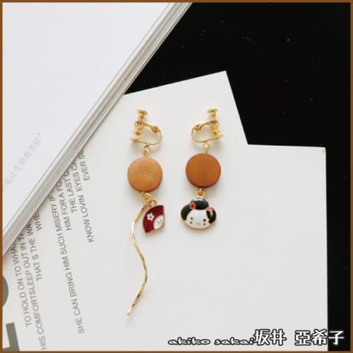 『坂井.亞希子』可愛Q版藝妓扇子不對稱造型垂墜耳環(耳夾款/耳針款)
