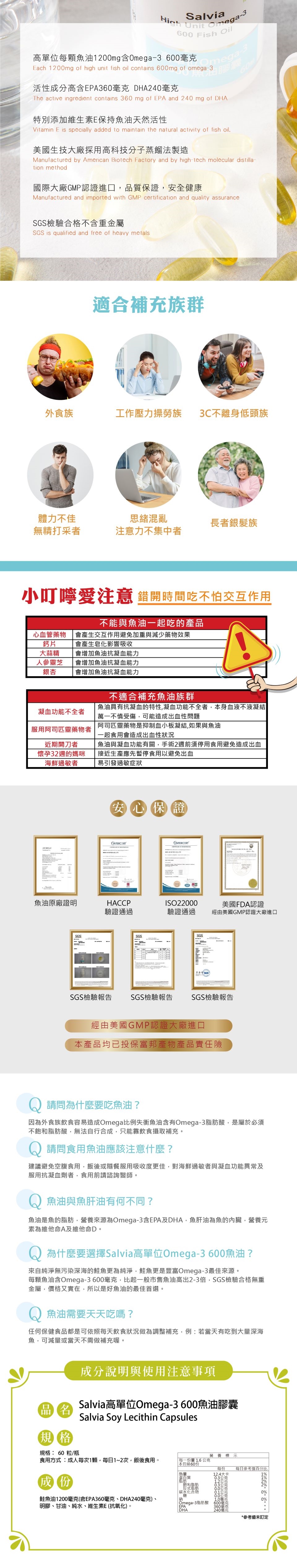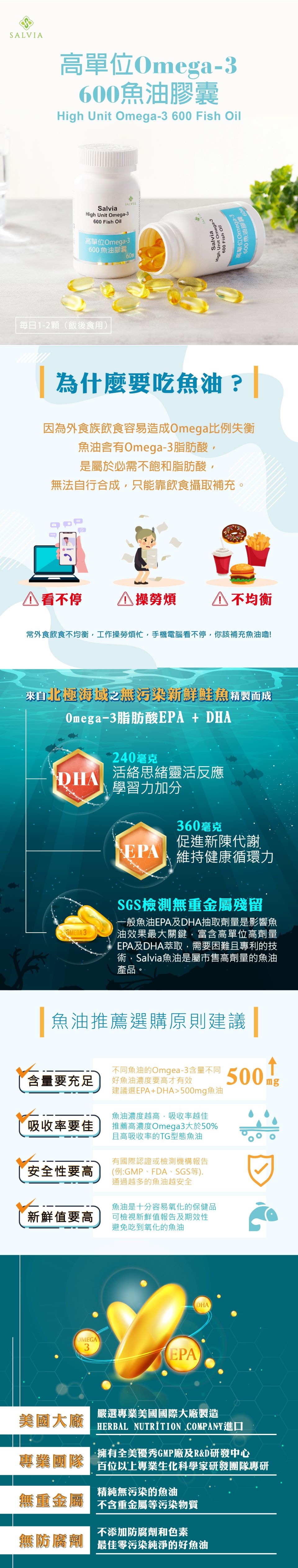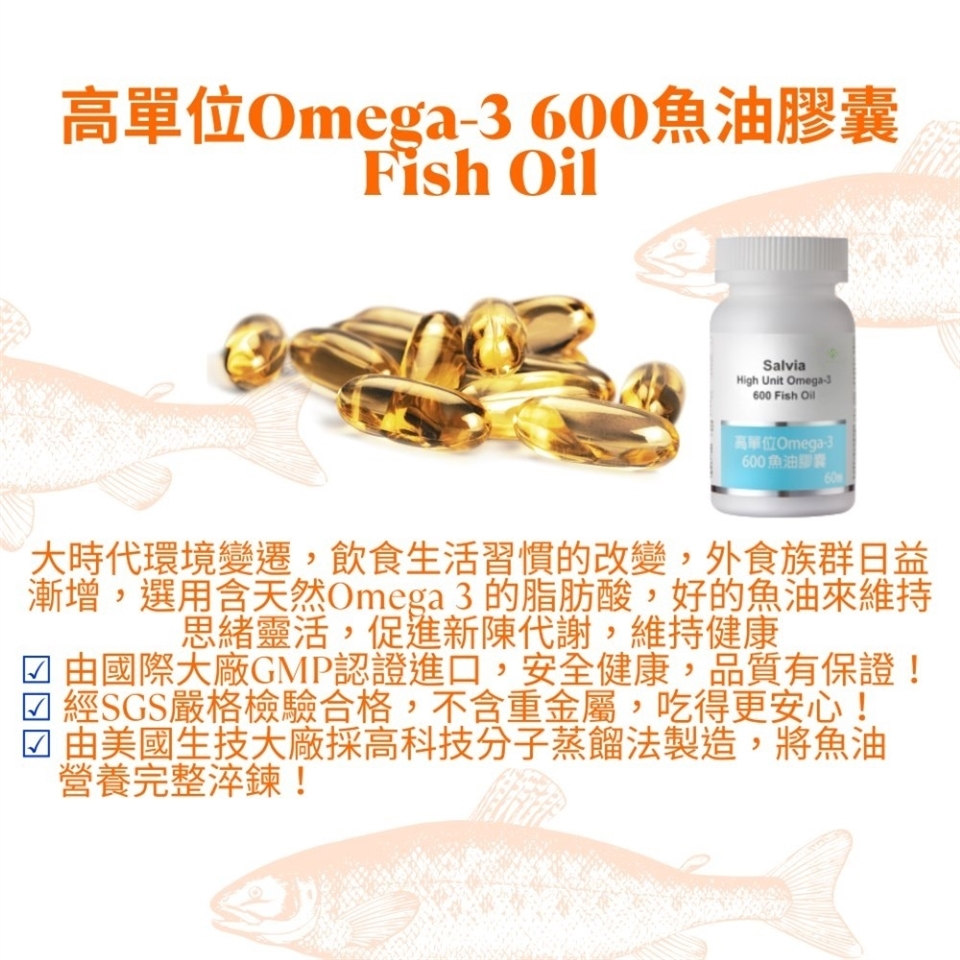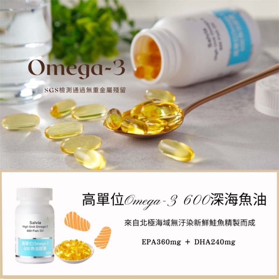 Salvia Omega-3 600 魚油 採用美國高科技分子蒸餾技術,將深海鮭魚的珍貴精華濃縮於每一顆膠囊中。