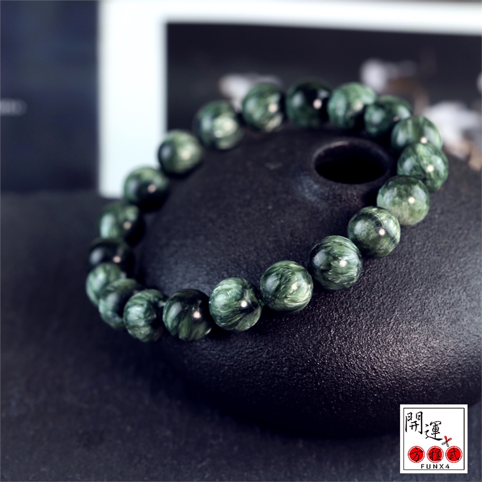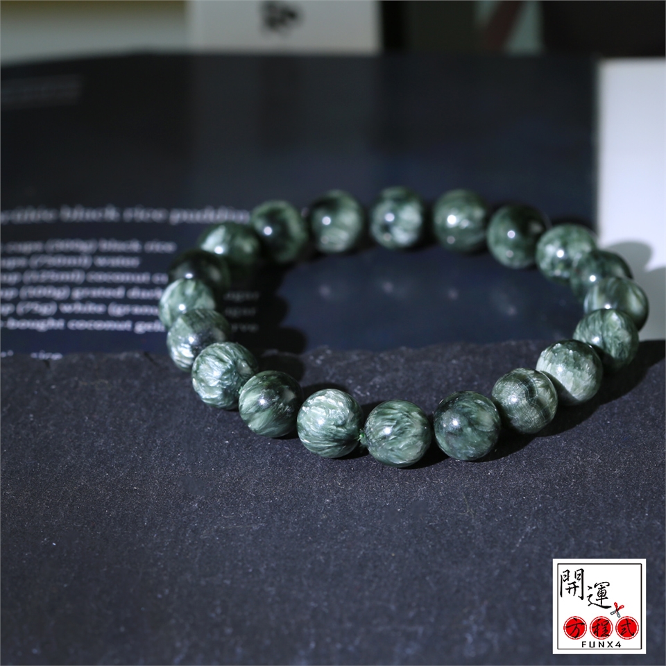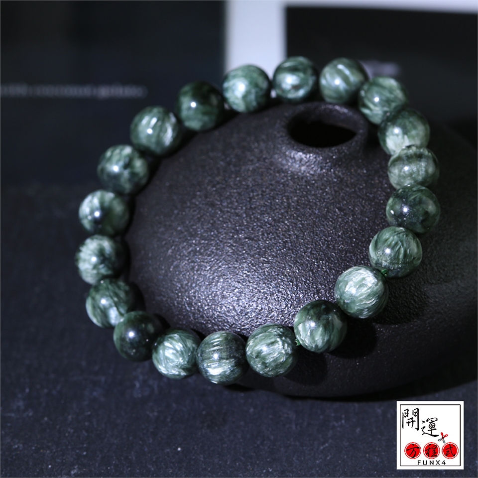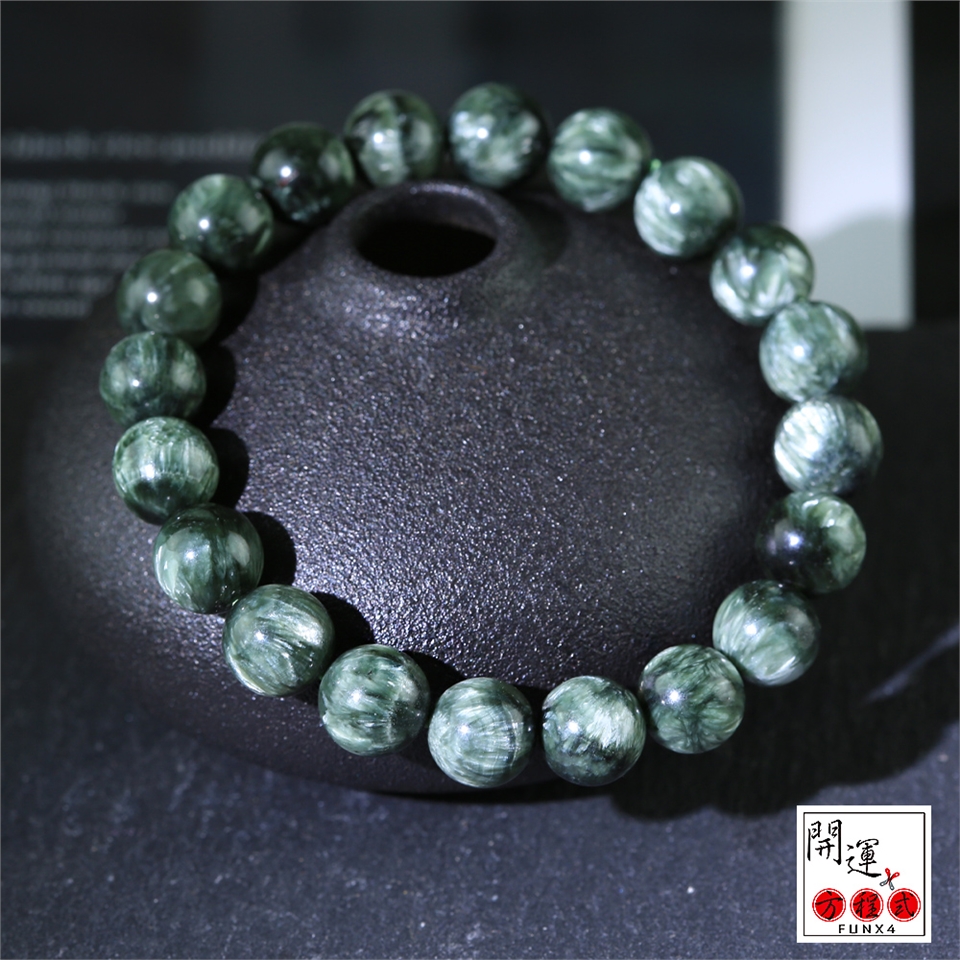 綠龍晶(Seraphinite)擁有由雲母的銀色羽毛光及珍珠光深綠色,像極了天使羽毛,因為它也是熾天使的代言者!治療寶石,對神經和腦細胞有好處