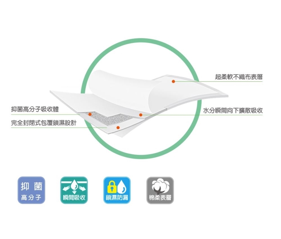 抑菌高分子吸收體,快速吸收,乾爽不回滲