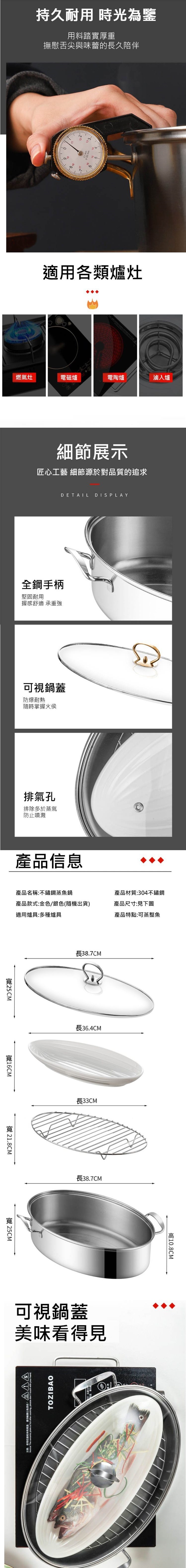 304材質,耐高溫不易生鏽厚實鋼材經久耐用,人性化設計可輕鬆蒸一整條魚,容量大而不擁擠,可透視鍋蓋美味熟食看的見,一鍋多用加大加寬,一體成形平整鍋底,導熱迅速均勻聚能,餐聚備餐新寵兒!