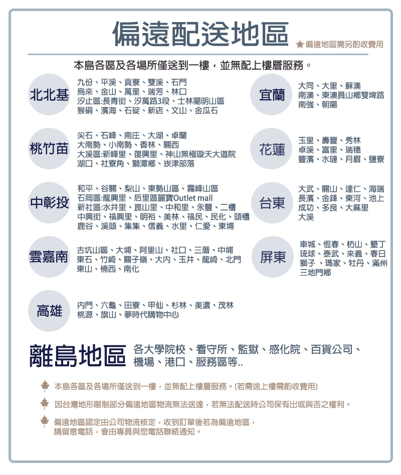 花蓮縣、屏東縣等實因特殊地型限制(山區、鄉鎮)無法送貨之地區 將由貨運電聯判定