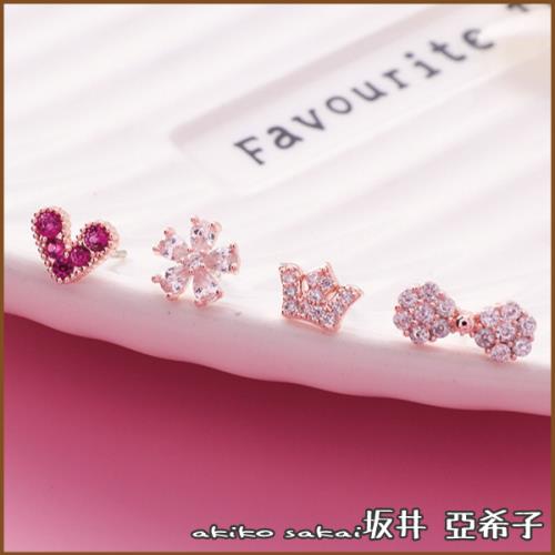 『坂井.亞希子』925銀針小巧精緻微鑲鋯石愛心/花朵/蝴蝶結/皇冠造型4件套組耳環