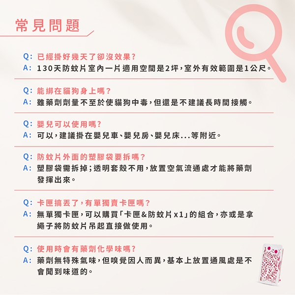 1. 本品選用除蟲菊精"美特寧"成分,在常溫下即可揮發,達到防治蚊子的效果。