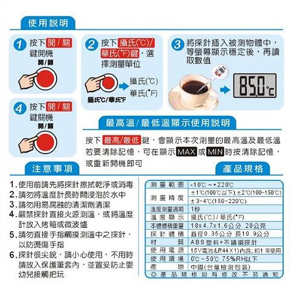 ※ 請勿直接手指觸摸測溫中之探針,以防燙傷手指。