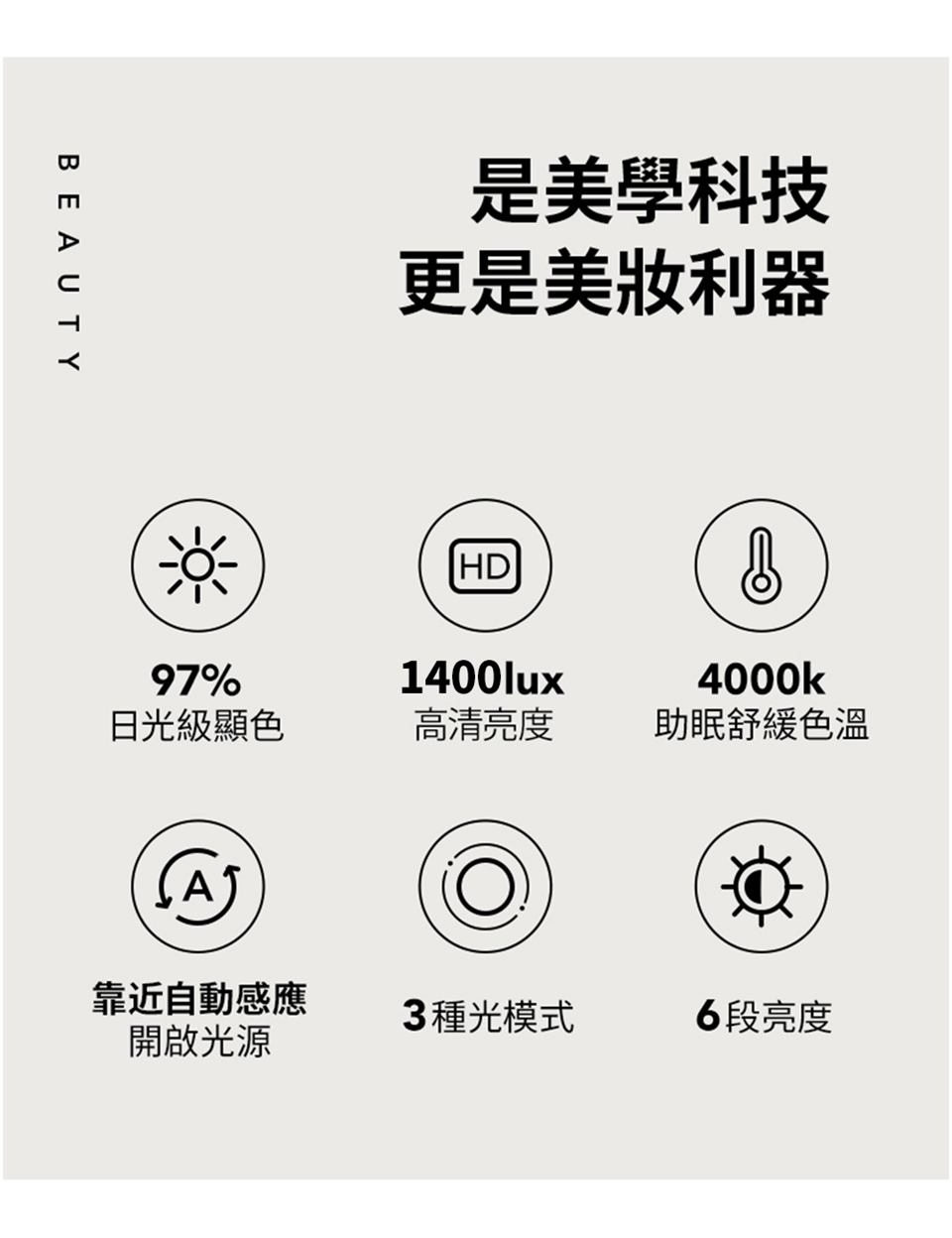 色溫光源: 明彩光(自然光) / 亮膚光(冷光) / 舒緩光(暖光)