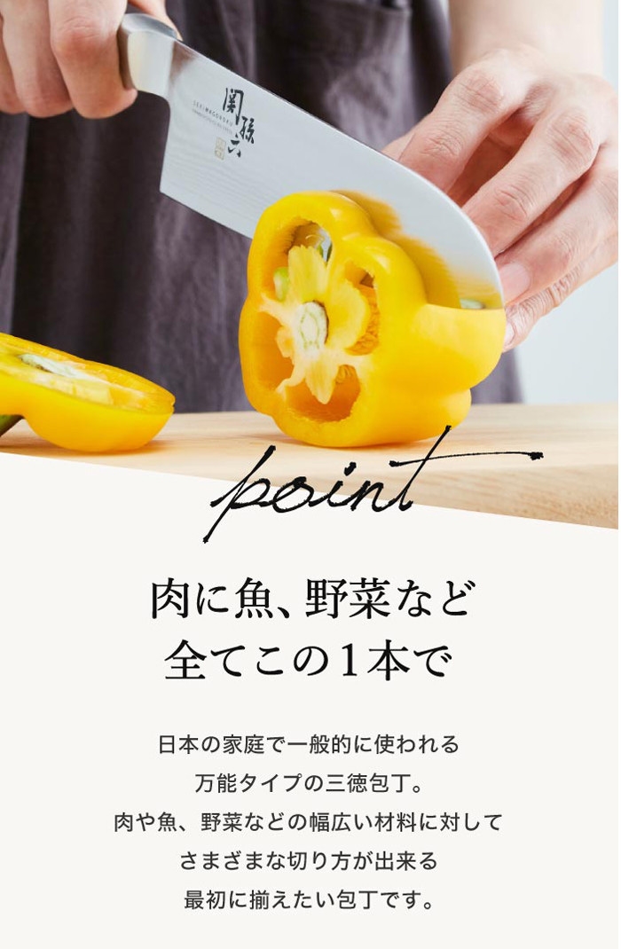 蔬菜、魚類、肉類,任何食材都可輕鬆處理。使用刀具的刀尖部分,還可以去除馬鈴薯芽眼等、食材中多餘部分。擁有這把萬能刀,即可應對每天基本料理所需。