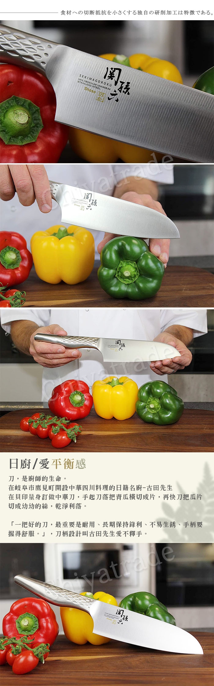 「切魚、肉、菜都沒問題,甚至很滑的魷魚都可以切出非常細緻的形狀。」刀刃夠利,刀柄設計叫古田先生愛不釋手,他說無論手怎樣轉動都可握緊手柄,感覺順手舒服︰「很多人認為中華刀重身最好,我覺得刀不宜太輕或太重,要取得平衡,才能把食材切出合適的粗幼。」
