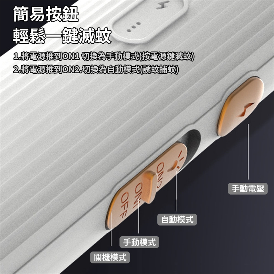 3. 電擊誘蚊模式:將電源開關推至”ON2”, 紫光LED燈發光且電網有高壓,