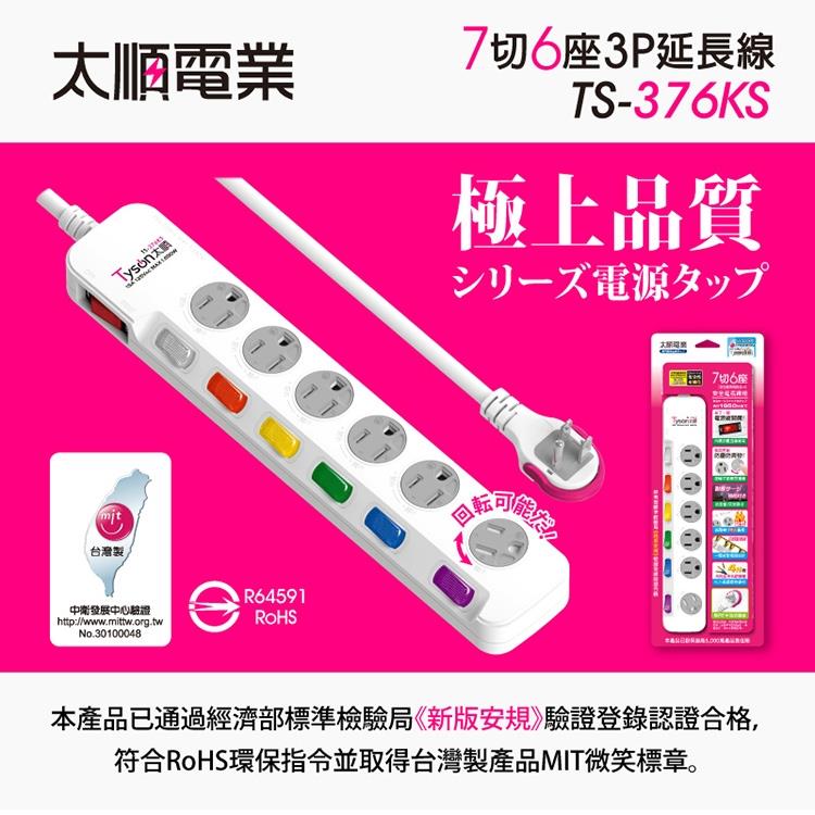 Tyson太順電業 376KS 3孔7切6座防塵蓋延長線(斜面開關/拉環扁插)
