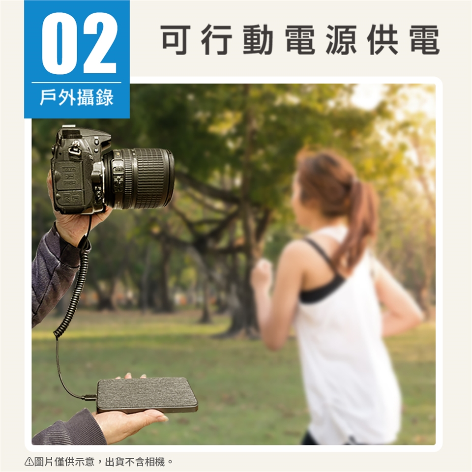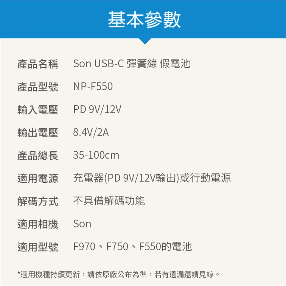 輸入電壓:PD 9V/12V 輸出電壓:8.4V/2A 彈簧線長:35-100cm(可拉伸範圍) 適用電源:充電器(PD 9V/12V輸出)或行動電源 解碼方式:不具備解碼功能 適用相機:Son
