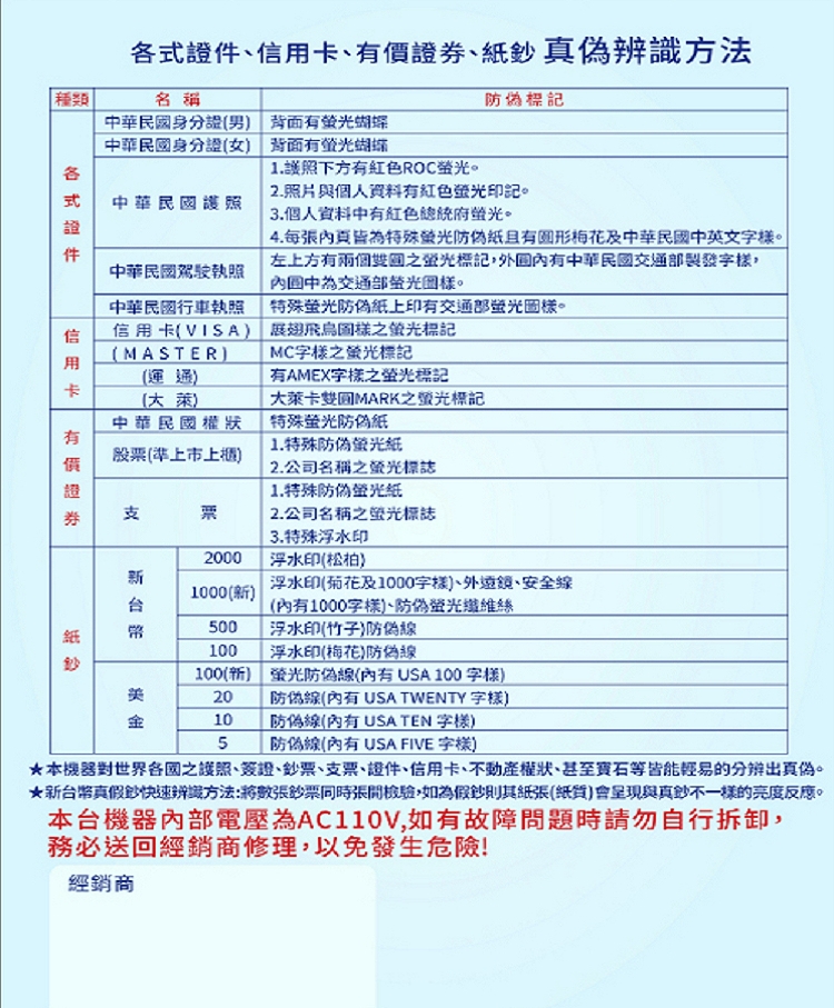 ◎可鑑定各國鈔票、信用卡、支票、護照、身分證、駕照、行照、土地權狀、上市上櫃公司股票、鑽石等…
