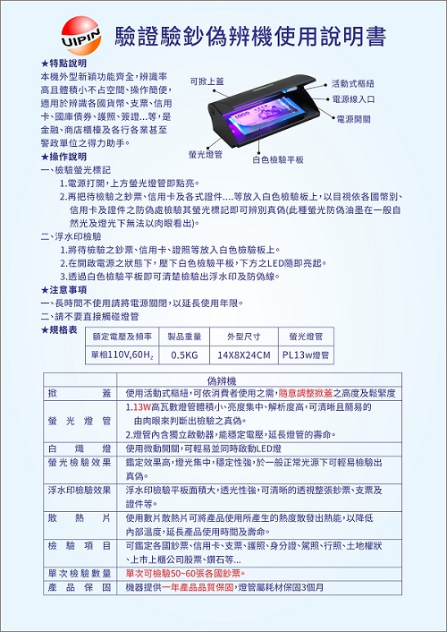 ◎13W高瓦數燈管體積小,亮度集中,解析度高,可清晰且簡易的由肉眼來判斷出檢驗之真偽