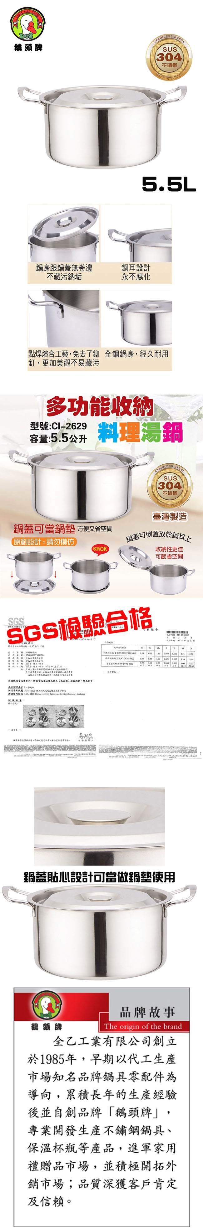 鵝頭牌 304多功能料理收納湯鍋5.5L附蓋 CI-2629 台灣製
