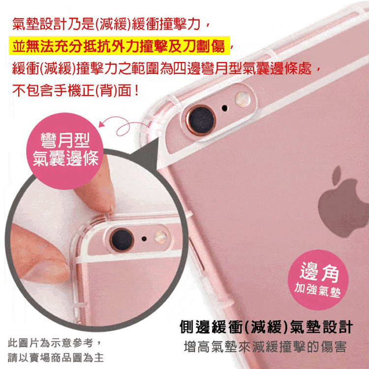 1.氣墊設計乃是(減緩)緩衝撞擊力,並無法充分抵抗外力撞擊及刀劃傷 緩衝(減緩)撞擊力之範圍為四角凸出防摔,不包含手機正(背)面及側面