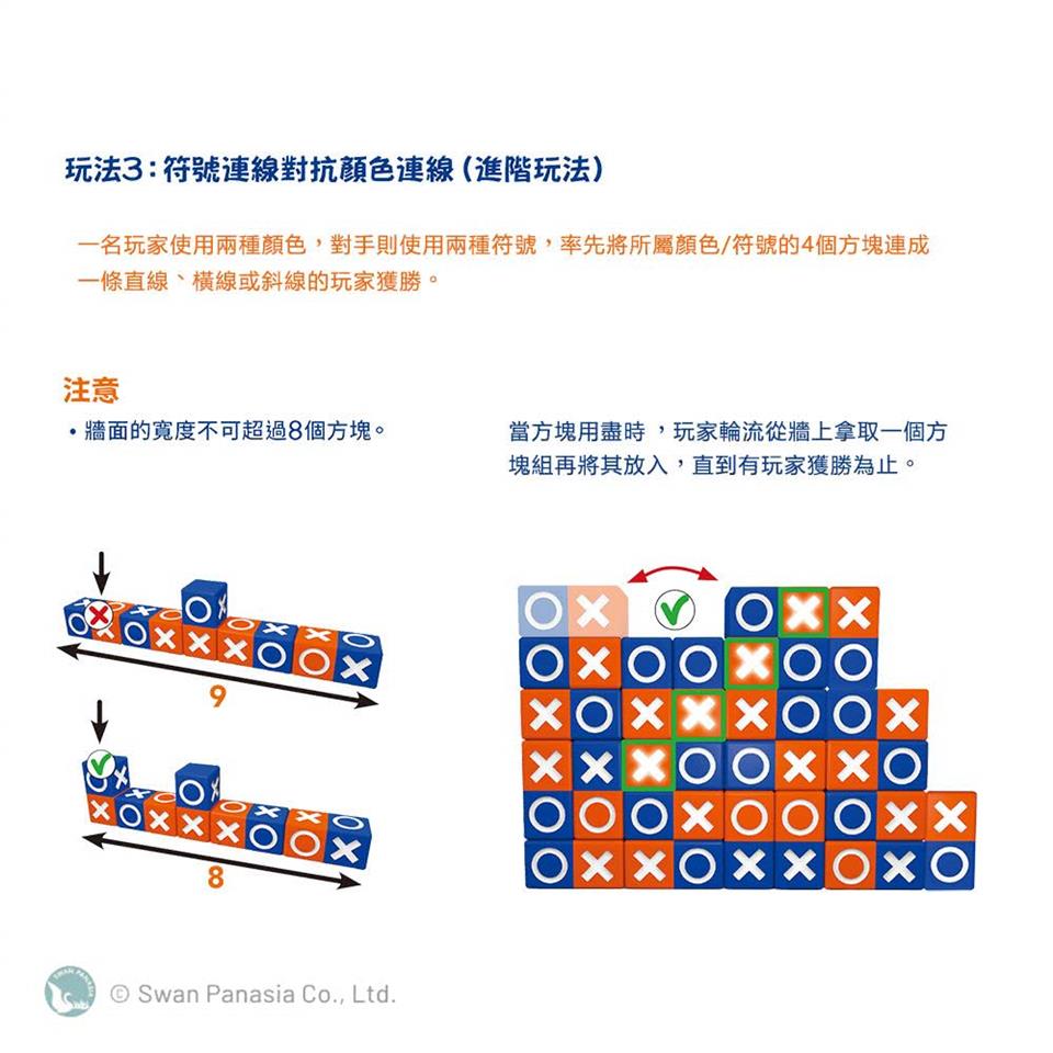 你所放置的每一個方塊組,同時包含對手的符號或顏色,若不仔細規畫戰術,你每放一個方塊組,都可能讓對手獲勝!